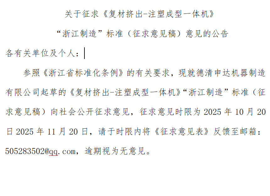 各有關(guān)單位及個人:參照《浙江省標(biāo)準(zhǔn)化條例》的有關(guān)要求,現(xiàn)就德清申達(dá)機(jī)器制造有限公司起草的《復(fù)材擠出-注塑成型一體機(jī)》“浙江制造”標(biāo)準(zhǔn)(征求意見稿)向社會公開征求意見,征求意見時限為2025年10月20日2025年11月20日,請于時限內(nèi)將《征求意見表》反饋至郵箱:505283502@qq.com,逾期視為無意見。附件:關(guān)于征求.docx團(tuán)體標(biāo)準(zhǔn)?71.docx征求意見表.docx編制說明.doc